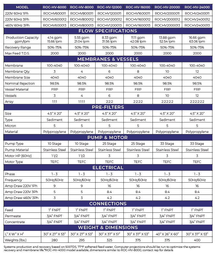 The ROC-HV Commercial Reverse Osmosis System is engineered for demanding commercial and light-industrial applications that require exceptional water purity, reliable performance, and long-term durability. Built with premium components and a robust powder-coated aluminum frame, the ROC-HV delivers consistent high output with minimal maintenance—making it ideal for manufacturing, food and beverage production, agriculture, laboratories, and large-scale facilities.